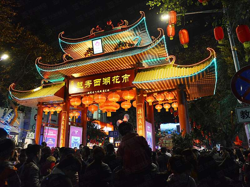 越秀区传统迎春花市主牌楼设在教育路北段(靠近中山五路),中心亭或花坛设在教育路与西湖路交界处。